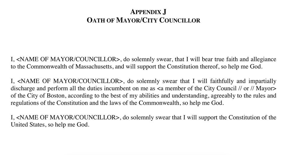 According to the Boston City Charter, the “Oath of Office” is a requirement for both the Mayor and all members of the Boston City Council.